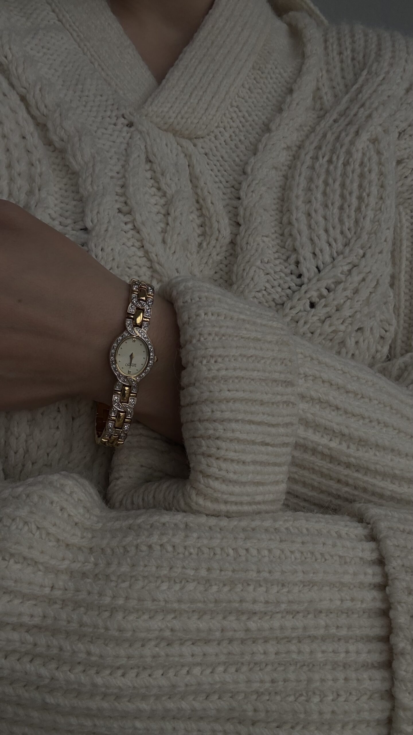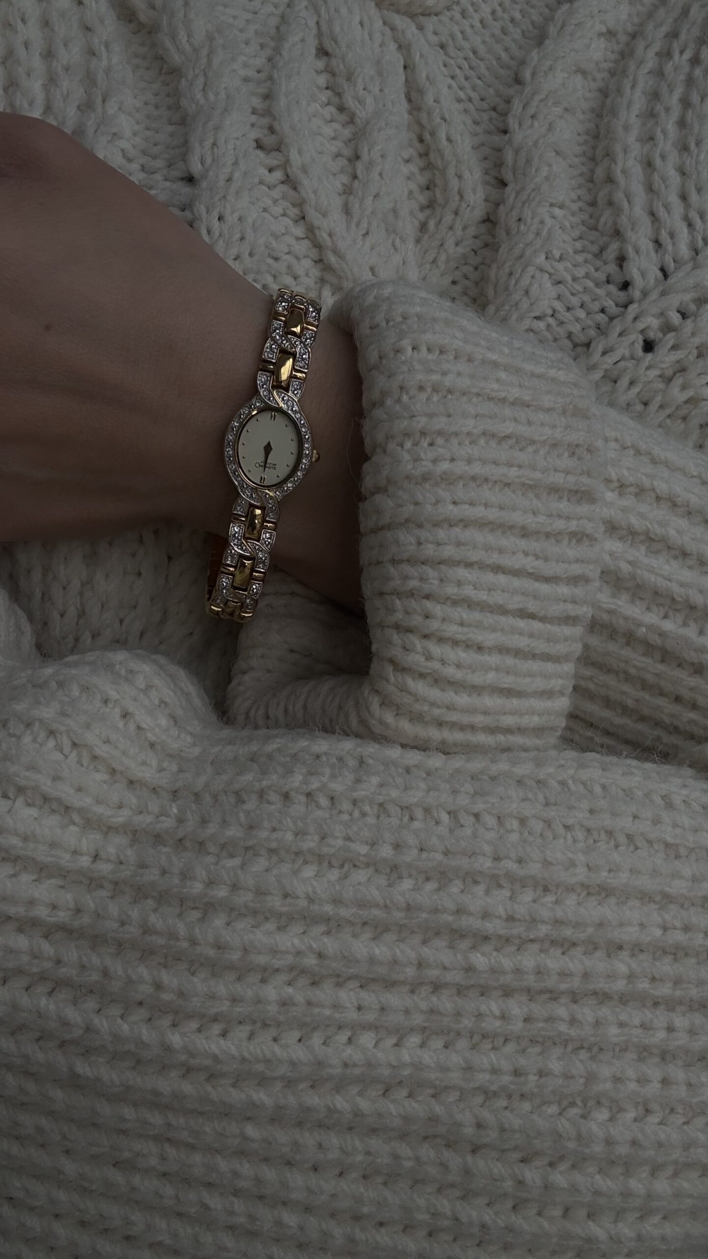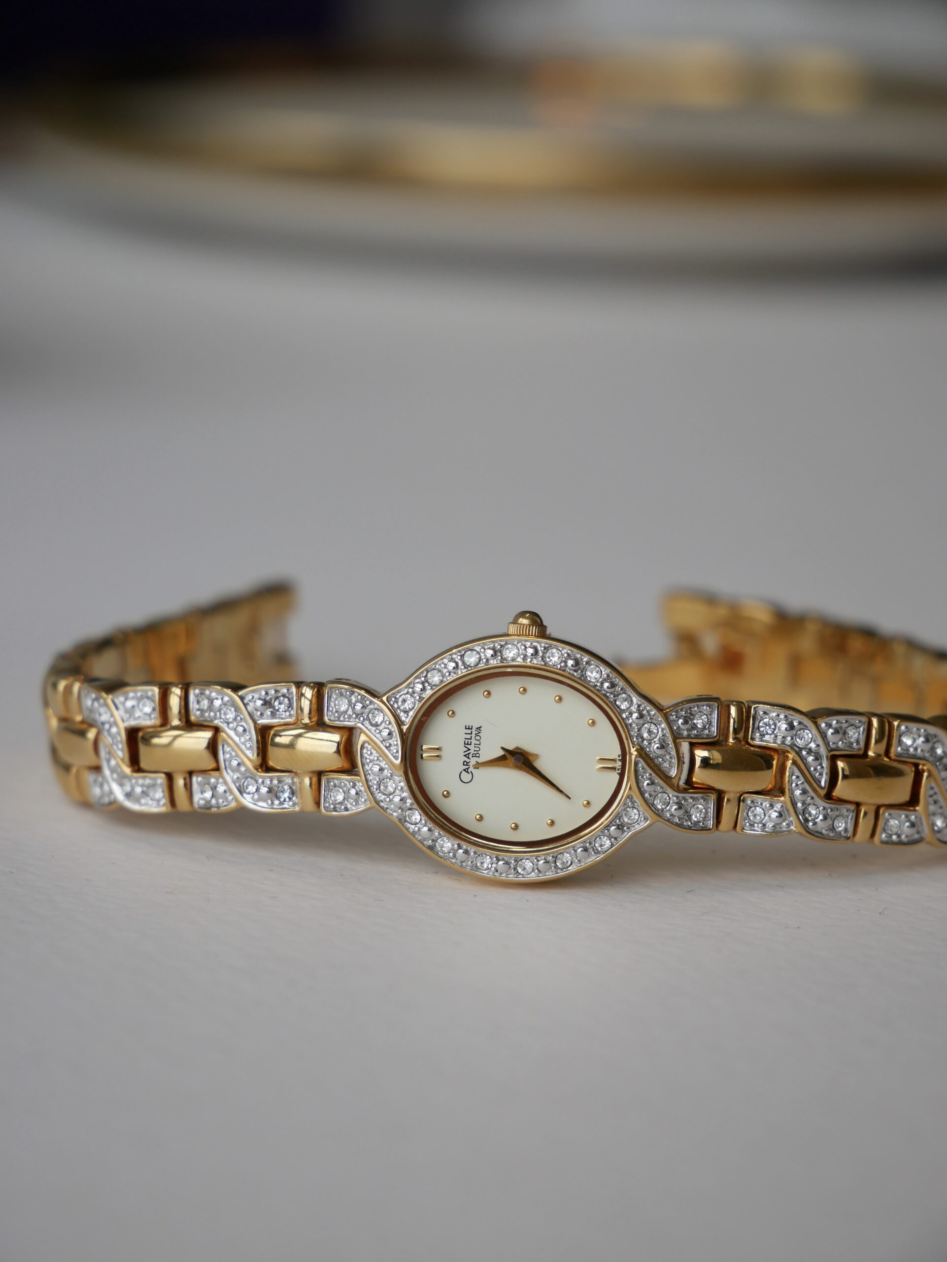 Корпус овальної форми обрамлений рядом сяючих кристалів, що м’яко підкреслюють циферблат і додають делікатного блиску.