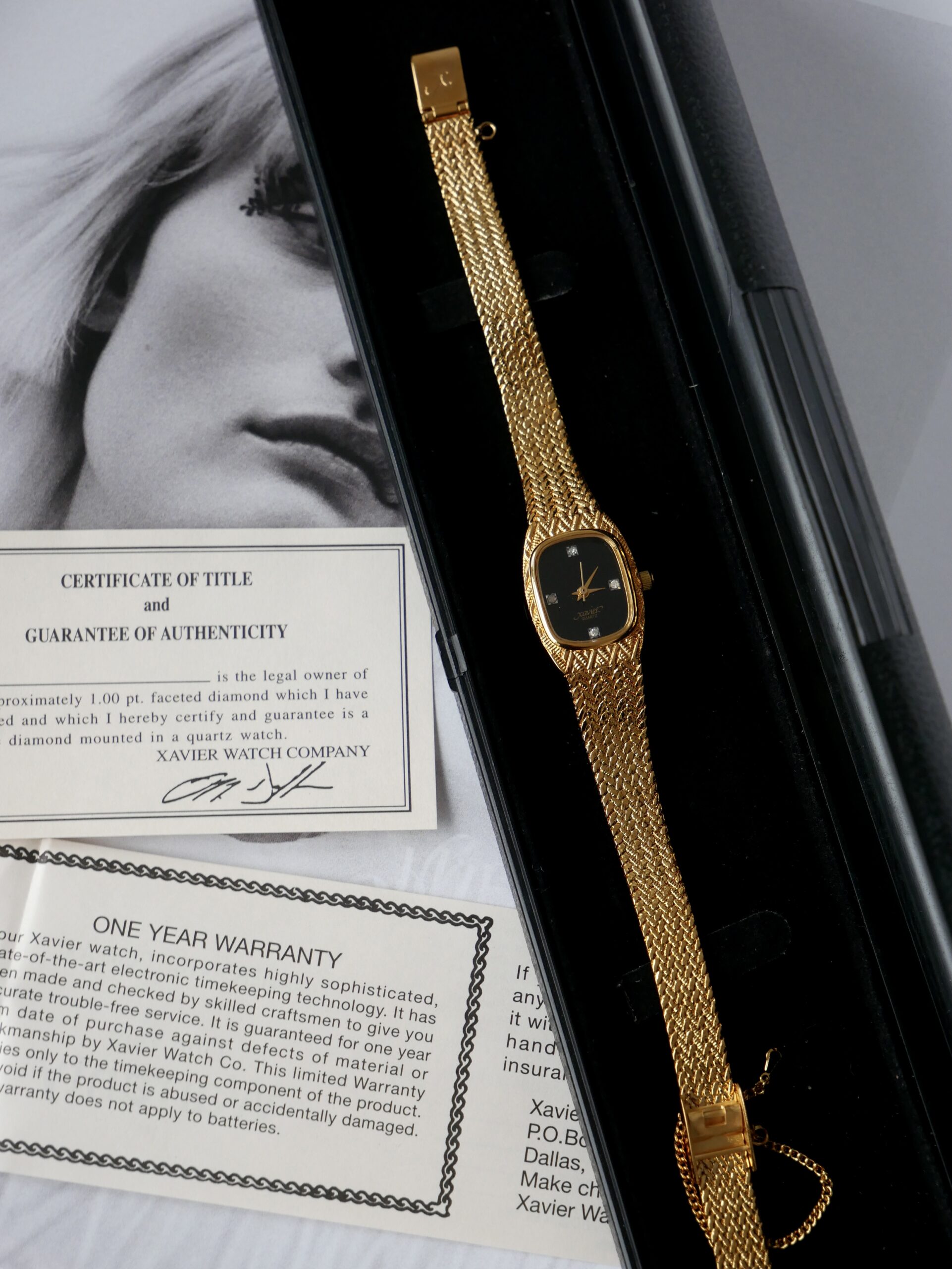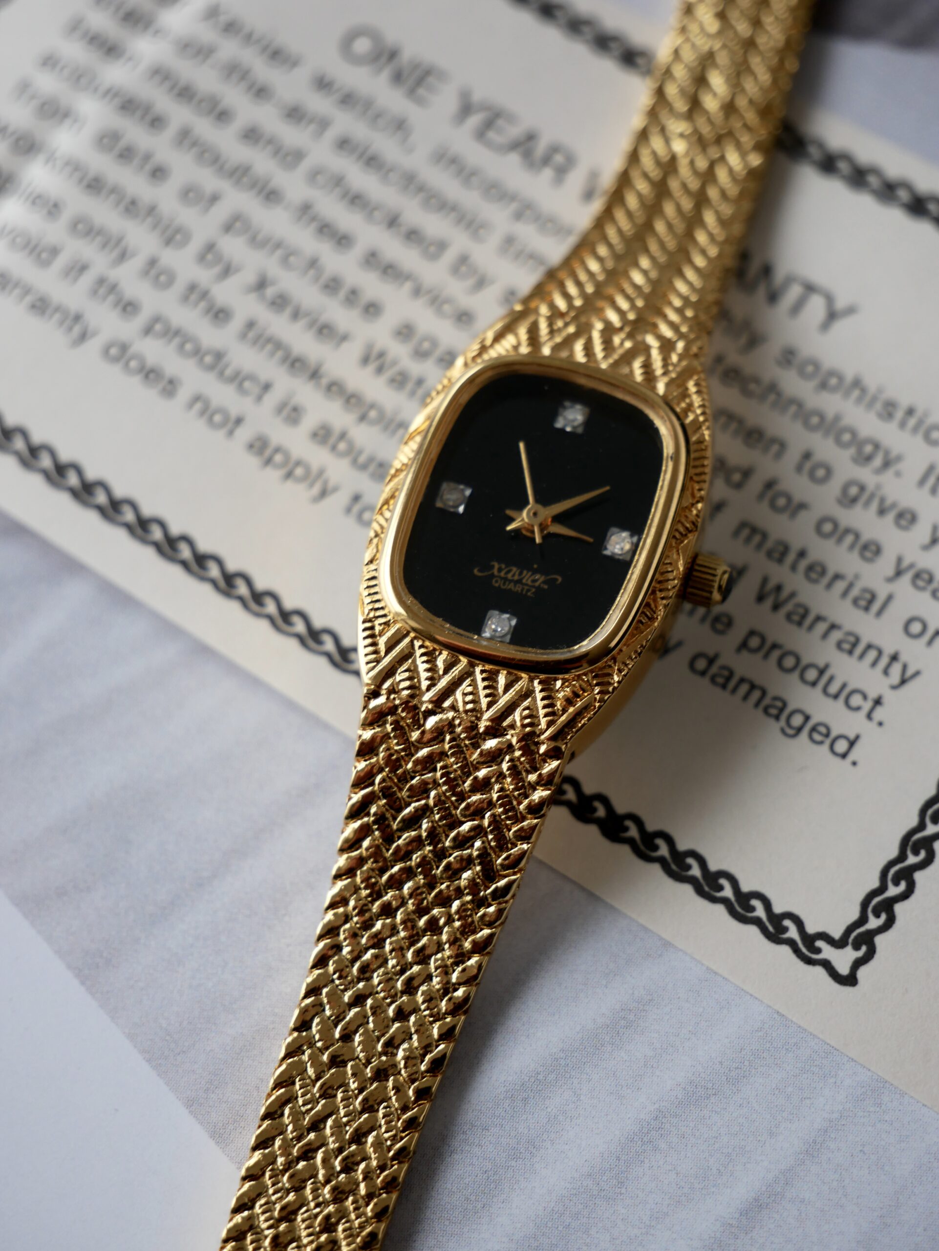 Циферблат чорного кольору, з чотирма дрібними діамантами, які виступають як годинникові мітки.. Стрілки в золотому тоні добре читаються на контрастному фоні.