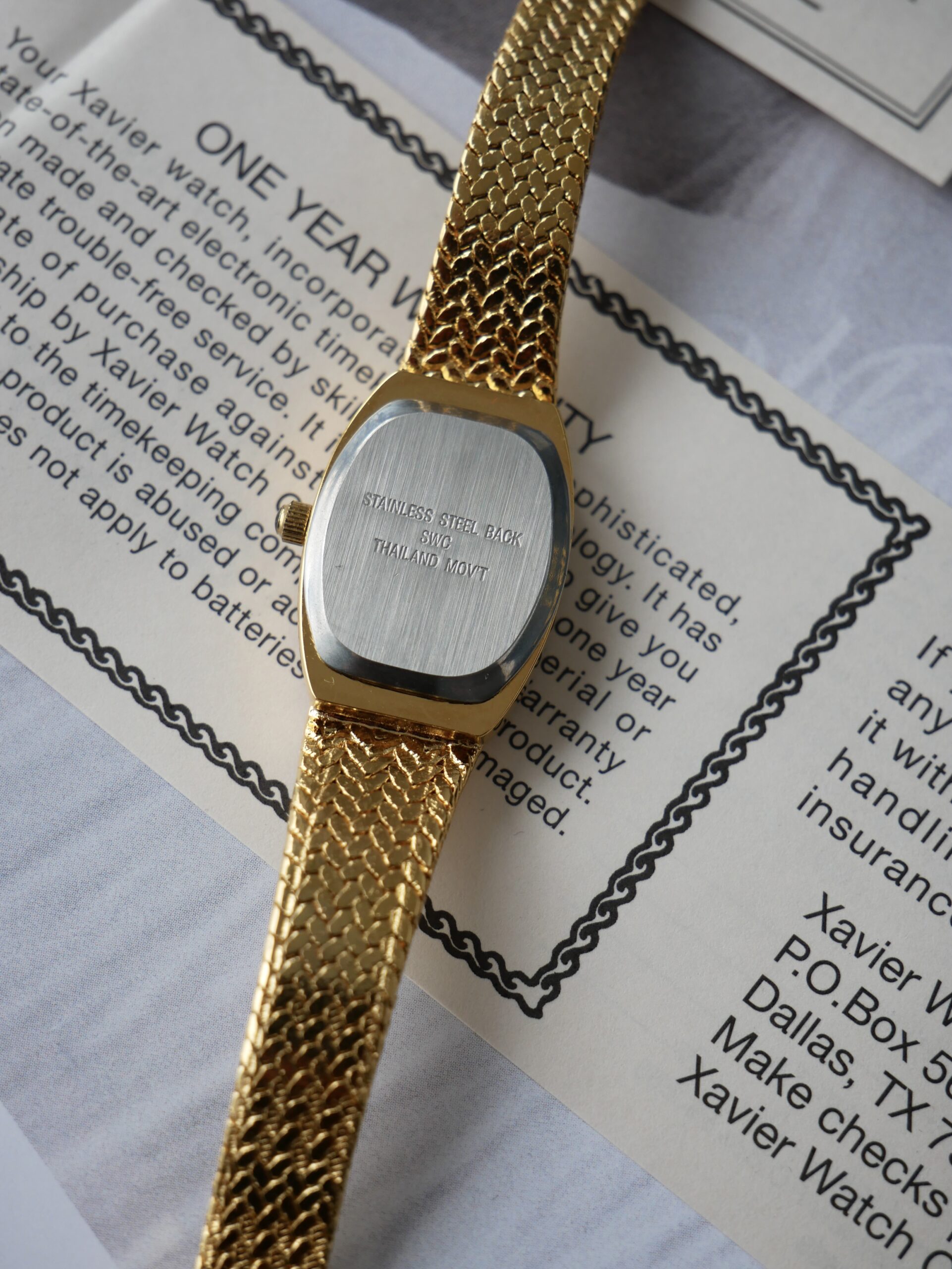 На задній кришці зазначено: нержавіюча сталь, кварцовий механізм (Thailand movt).