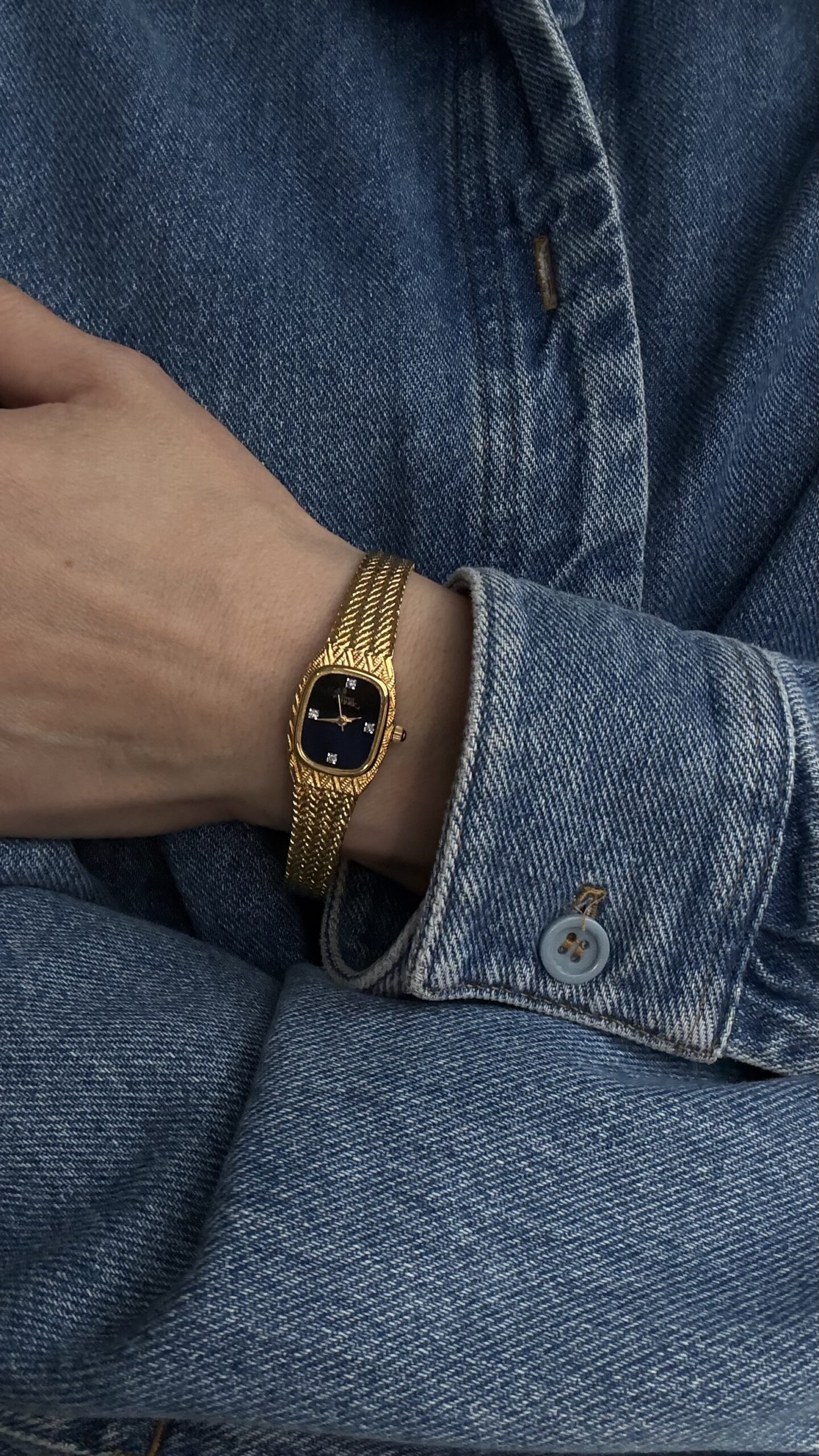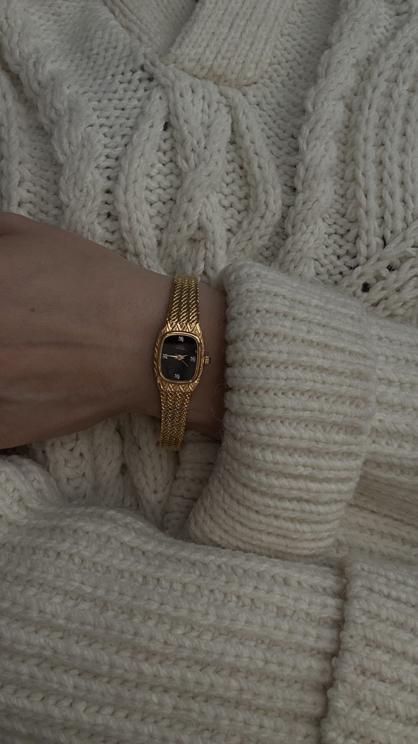 Модель у золотому тоні з інтегрованим браслетом, виконаним у фактурному плетінні.